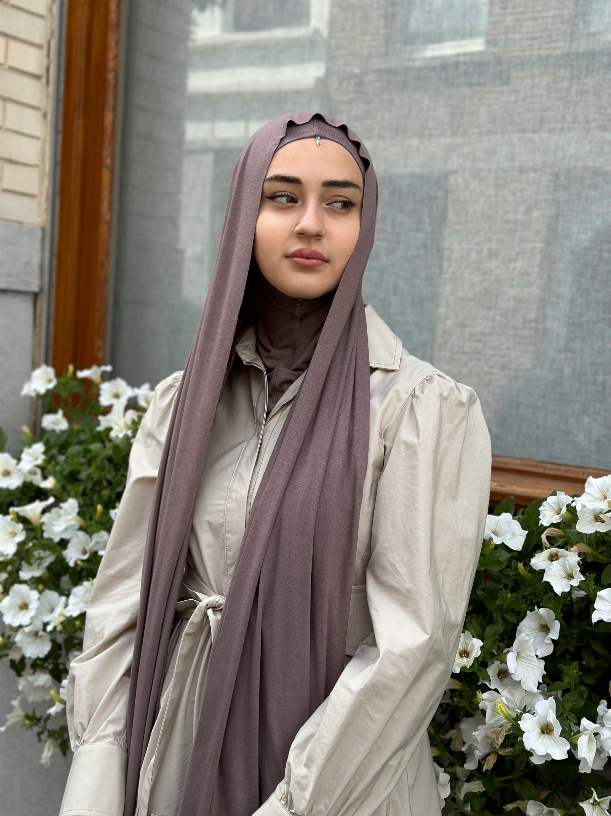 Un ensemble composé d'une balaclava avec une perle et d'une écharpe de la marque Annur Clothes. Ces deux pièces s'accordent parfaitement entre elles, créant un hijab respirant et très agréable à porter. Il existe en trois couleurs : beige, noir, mocca, gris et rose.